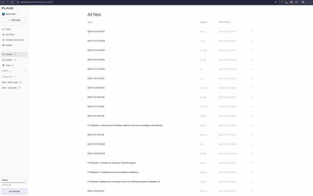 During our continuous-recording test, we also discovered that PLAUD automatically splits long sessions into 5-hour maximum files. After the 28-hour test, we ended up with several consecutive 5-hour segments. This behavior is likely intentional to preserve file stability and to keep uploads manageable.