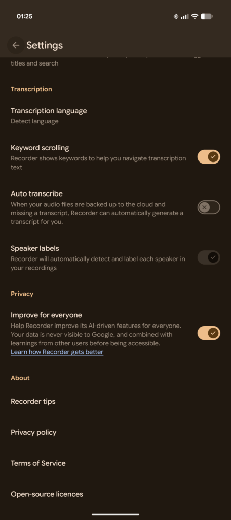 There is a notable functional difference when it comes to speaker separation and language detection. On Pixel devices, enabling automatic language detection typically disables speaker identification, meaning the transcript won’t label different speakers during multilingual or mixed conversations.